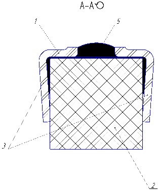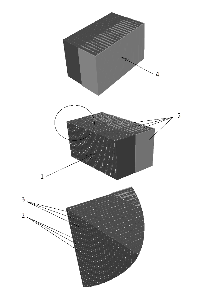 1 – рабочая сторона контакта 2 – анизотропный графит 3 – сквозные каналы серебряной проводимости 4 – сторона токосъема 5 – пластины токосъема |