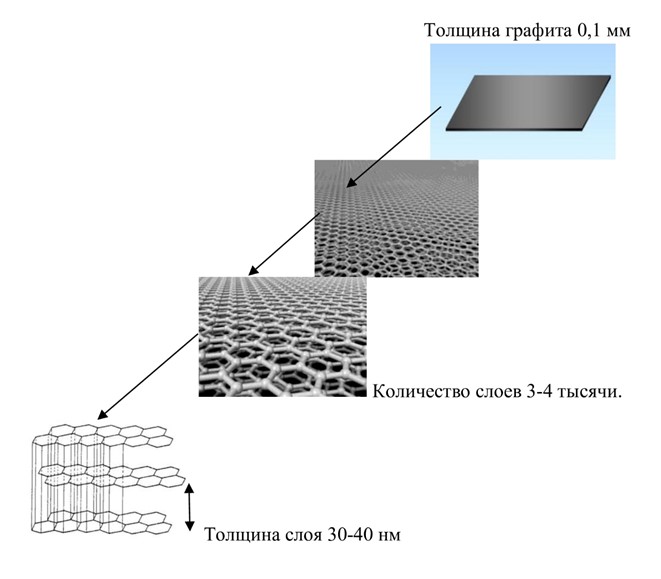 Суть технологии – расщеплении графита на элементарные графеновые чешуйки, их однонаправленная ориентация и послойное компактирование. Таким образом, рабочая область контакта образована торцами графеновых элементарных частиц графита, что придает общей структуре контакта новые анизотропные механические и электрические свойства.
