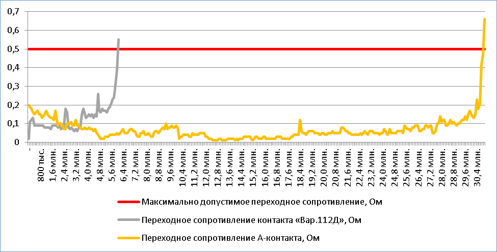 По результатам прямых испытаний ресурс составил 30,8 млн. коммутаций (при достаточной наработке 1,2 млн.).