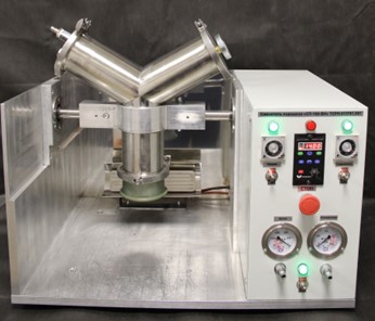 Рабочая емкость смесителя порошков представляет собой Y-образный контейнер из полированной нержавеющей стали. Загрузка порошковых компонентов в смеситель порошков выполняется через отверстия Y-образных ответвлений контейнера, которые герметично закрываются крышками с силиконовыми уплотнителями. Рабочая емкость смесителя порошков вращается, обеспечивая трехмерное движение частиц материала. Преобразователь с высоким моментом вращения при запуске и с датчиком-тахогенератором регулирует (поддерживает постоянной) заданную частоту оборотов рабочей Y-образной емкости (контейнера).